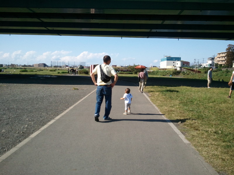 ↑二子玉川から多摩川の土手まで散歩。慧の進行方向を微調整しながら歩くぼくの後ろ姿です。天気が良いときは敷物を持参して河原でメシを食う我が家です。(朗)