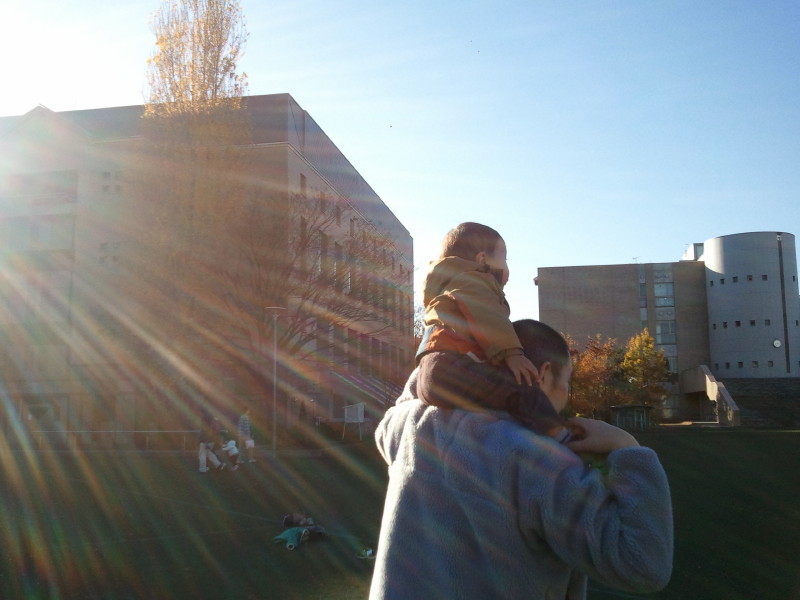↑慧を肩車したところを、逆光気味に撮影してもらったらこんな感じに。スマホでも面白い写真が撮れるものですね。(朗)
