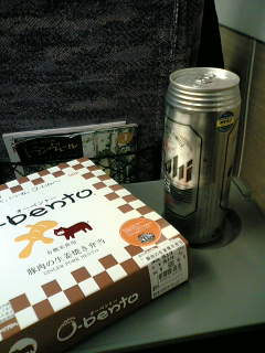 満員電車を乗り継いで東京駅に。新幹線に乗ってとりあえず朝からビールを。