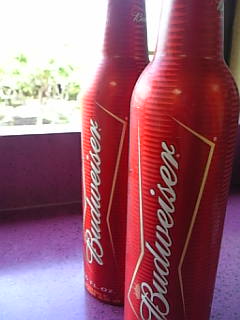 待ち時間にビール。カンなのにビン型のBudweiserなのだ。
