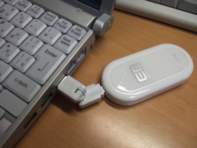 本来、付属のUSBケーブルで接続するのだけれど、ケーブルだとPCの操作中に置き場所に困ることがある。ということで3D USBアダプタというものを導入。コネクタが自在に曲げられて保持力もあるから端末を立てたり寝かしたりと適度に配置できて便利。後発のカードタイプであるD02NEを買い増ししたいけど、高いんだものなあ。