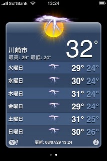 iPhoneで画面キャプチャ。ホームボタンと電源ボタンを同時押し。しかし週間天気がすべて「雷雨」てどういうことよ。